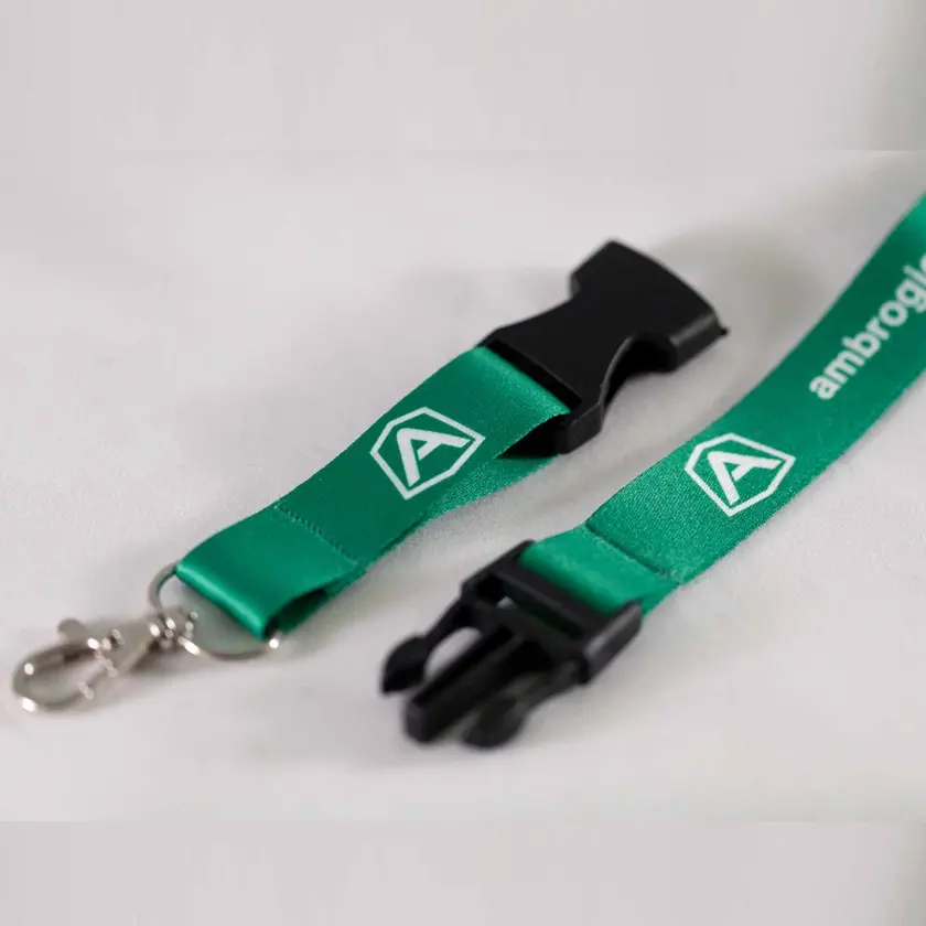 Questo lanyard può essere realizzato in diverse larghezze — 10 mm, 15 mm, 20 mm e 25 mm — per adattarsi a ogni esigenza di visibilità e comfort.